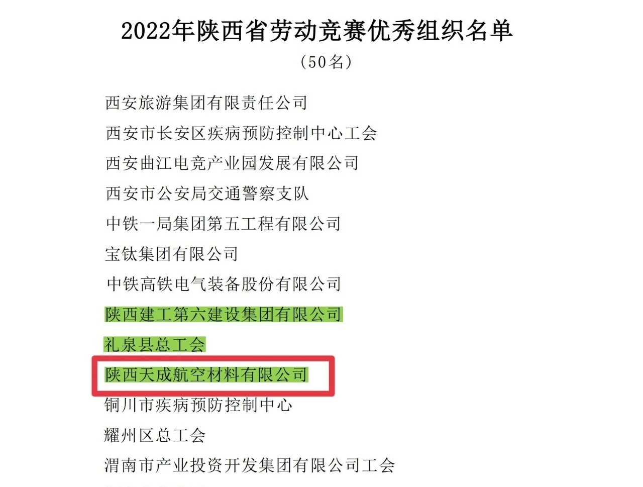 近日,陜西省勞動競賽委員會公布了2022年陜西省勞動競賽優勝集體和優秀個人名單,天成航材榮獲2022年“陜西省勞動競賽優秀組織”稱號。
